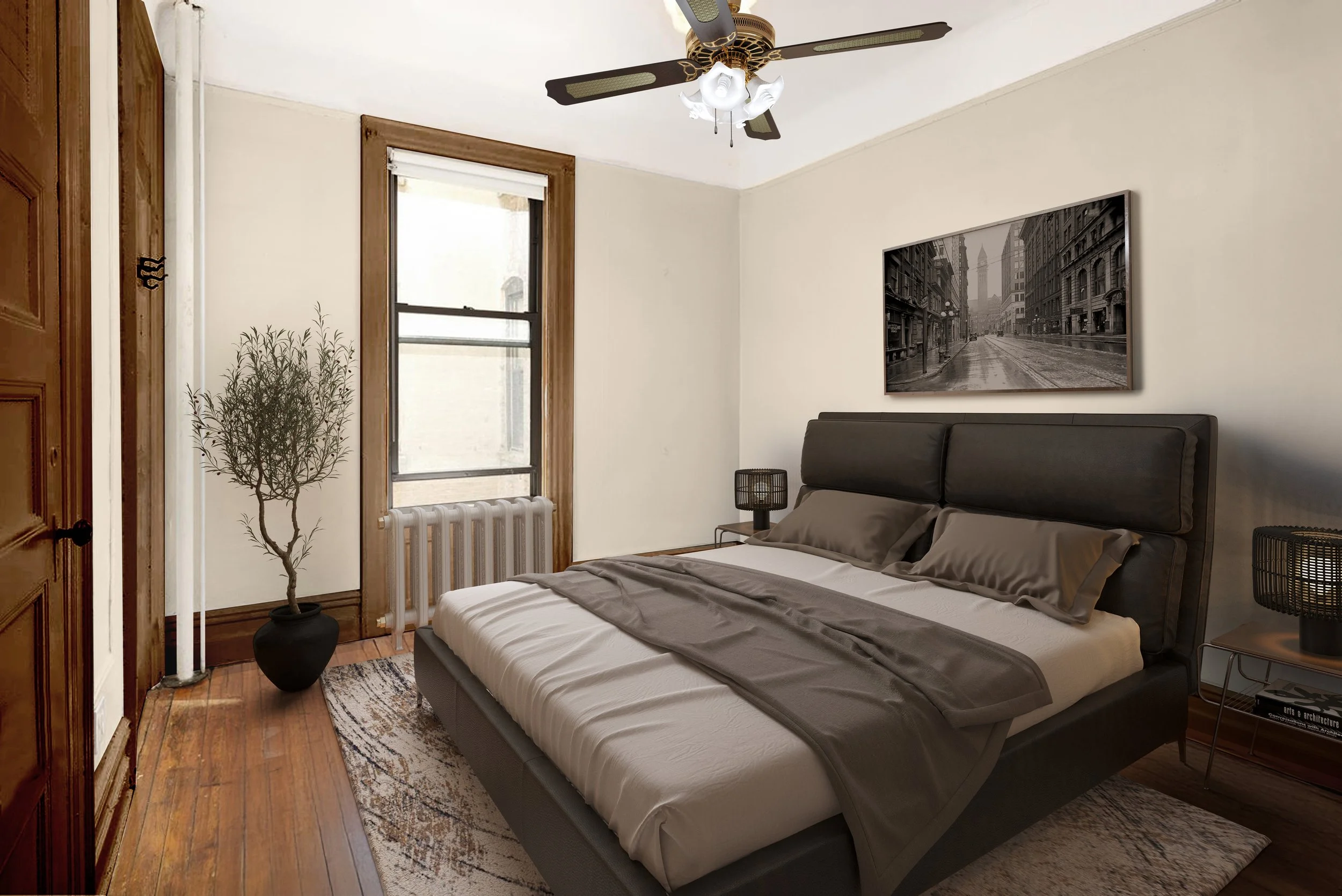 Enter a large front entertaining salon facing a quaint, tree-lined brownstone block, where a showpiece fireplace with decorative mantel anchors the room. In addition, door and window moldings, classic window shutters, and hardwood floors create a warm, authentic pre-war ambiance buyers seek in Harlem brownstones. The windowed kitchen features stainless steel appliances, generous cabinet storage, and a smart, functional layout for cooking and hosting.